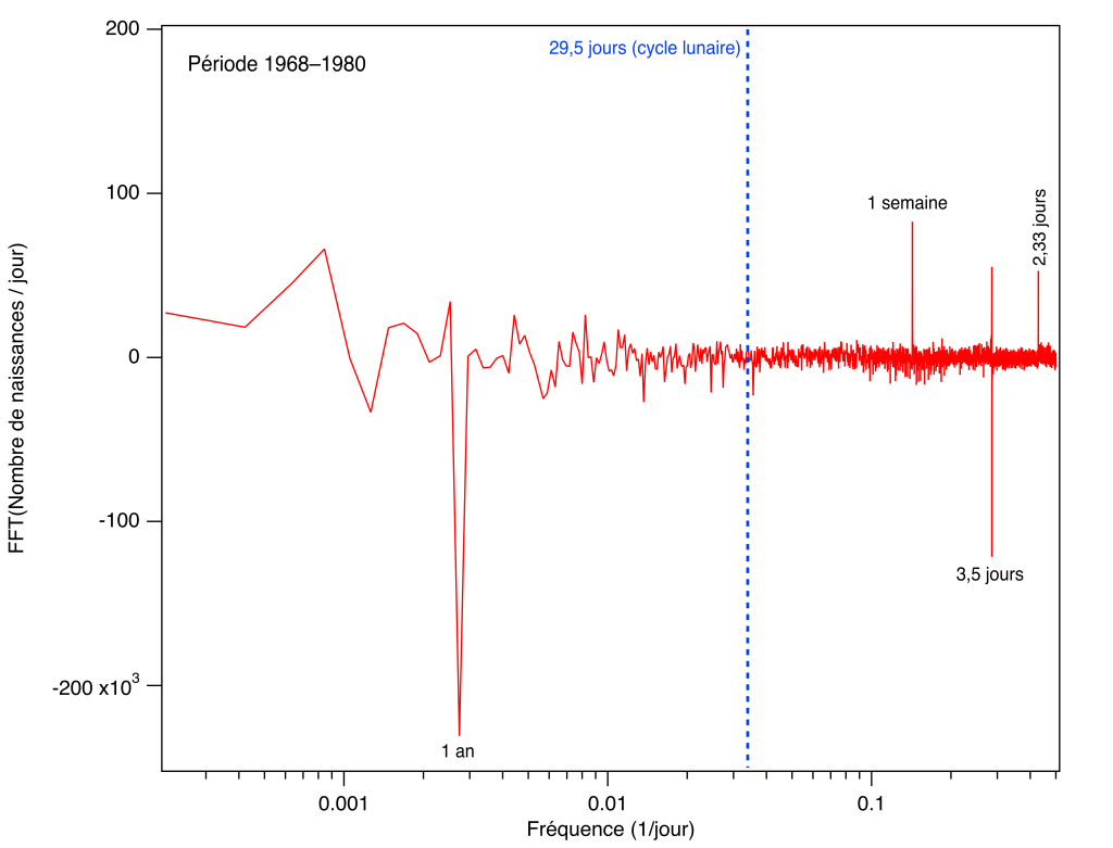 Enfin, une approche un peu plus mathématique : l’analyse de Fourier. Si nous prenons les données quotidiennes des naissances sur les 52 ans disponibles à l’INSEE et que l’on en effectue une Transformée de Fourier (techniquement ici, une FFT à l’aide du logiciel Igor Pro), on obtient les fréquences présentes dans ce « signal ». Ce qui est absolument remarquable, c’est qu’on trouve différentes périodes (qui s’expliquent plus ou moins), mais absolument pas celle correspondant au cycle lunaire.