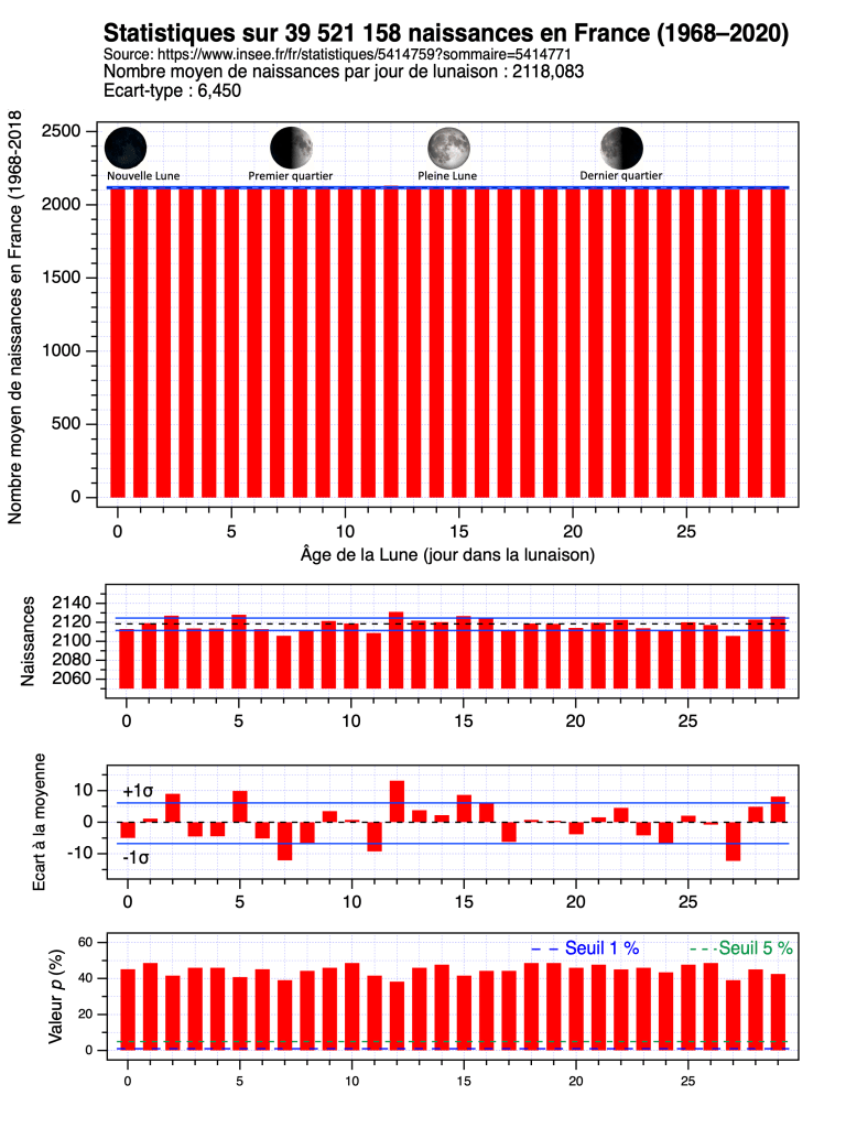 Le panneau du bas donne la « valeur p » qui est la probabilité, ici pour chaque jour de lunaison, de trouver un écart à la moyenne (de 2118 naissances par jour) au moins aussi « extrême » que celui observé. On est très au-delà des seuils usuels de 5 % et 1 %.