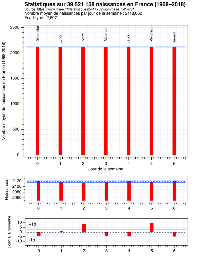 On peut de plus monter que la moyenne des naissances varie en réalité très peu selon le jour de la semaine.