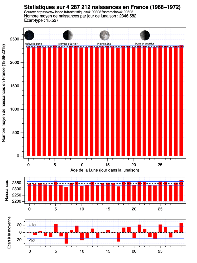 Voici les données françaises de l’INSEE de toutes les naissances de 1968 à 2020, classées par jour de lunaison. On n’observe absolument aucune variation statistiquement significative.